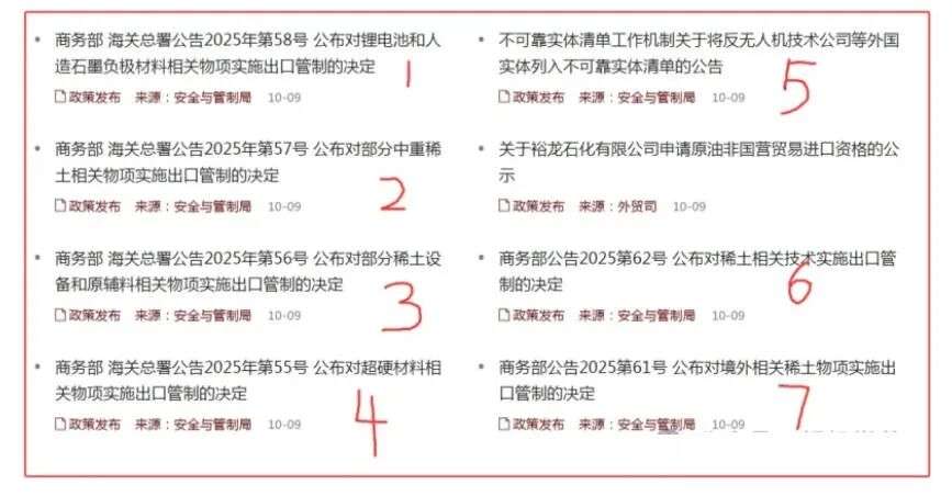 同一天,中国商务部一轮齐射,7发炮弹都是对相关物项和技术进行出口管制或者更新不可靠实体清单的,涉及锂电、无人机和反无人机、稀土、超硬材料、芯片等领域。