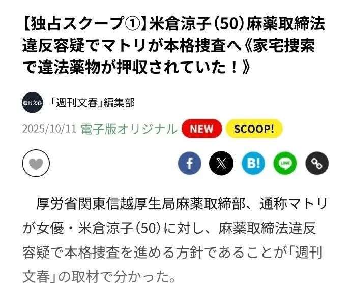 很快日娱出动,据爆料,米仓凉子可能摊上大事了,疑似跟毒品有关!