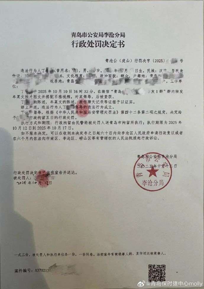 10月12日,牟女士在社交平台发布的青岛市公安局李沧分局行政处罚决定书显示,根据有关规定,决定给予涉事男子行政拘留五日的行政处罚。