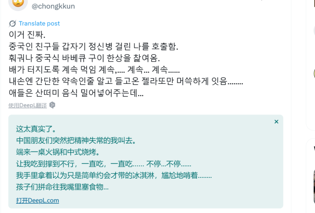 于是两边各自好意,节拍却错了半拍:韩国朋友碗见底,意思是“我吃饱啦,感谢招待”;中国主人见碗见底,理解成“天哪加得不够,快加!”