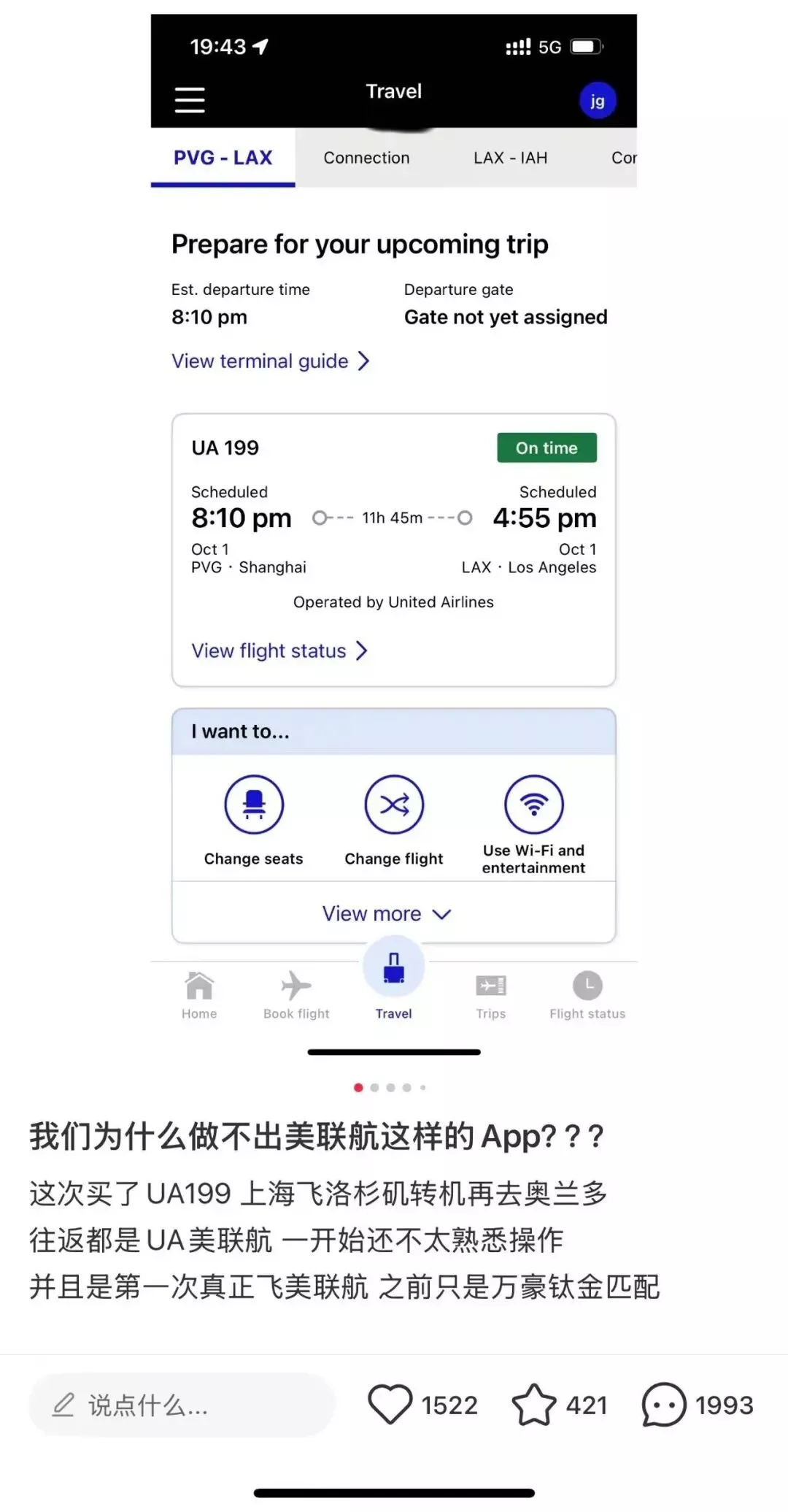 这位网友原定10月1日乘坐美联航UA199航班,从上海出发,经洛杉矶、休斯顿中转,最终抵达奥兰多。临行前,他在小红书晒出美联航App页面,本想称赞其使用体验,却不小心暴露了姓名、航班订单号等全部关键信息。