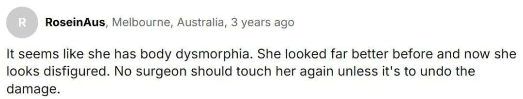 “她可能有身体畸形恐惧症。她整形前看起来好多了,现在却‘面目全非’。除非是为了修复损伤,否则任何医生都不应该再给她做手术。”