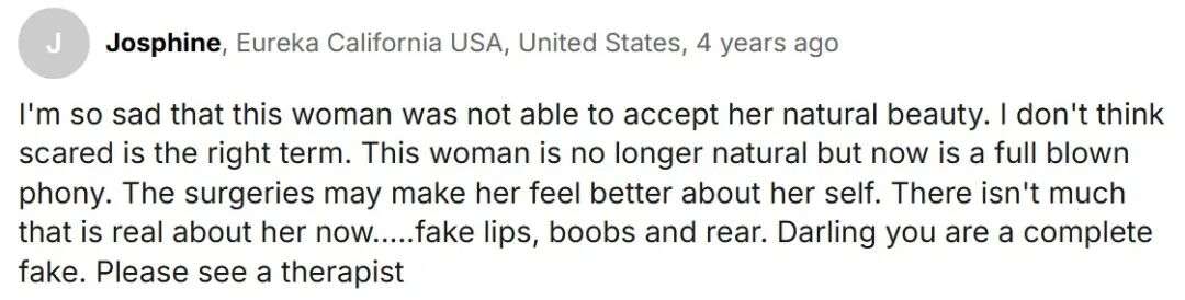 “我很难过,她无法接受自己的自然美。我认为‘害怕’这个词并不恰当。她已经不再自然了,而是个彻头彻尾的假人。整形可能让她我自感觉好一些,但她现在几乎没有什么是真实的了……假的嘴唇、胸部和臀部。亲爱的,你完全是个假人。请去看心理医生。”
