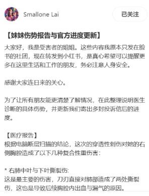 根据后续报道出的消息显示,受害者的姐姐发帖:此次穿透性刺伤对她的右侧胸腔造成了几种复合性重伤害,包括右肺中叶与下叶撕裂伤,这是主要伤害,刀刃直接对肺部造成了多处撕裂伤,因肺部有创口,空气从肺部漏出至胸腔,造成部分肺叶塌陷,影响呼吸功能。