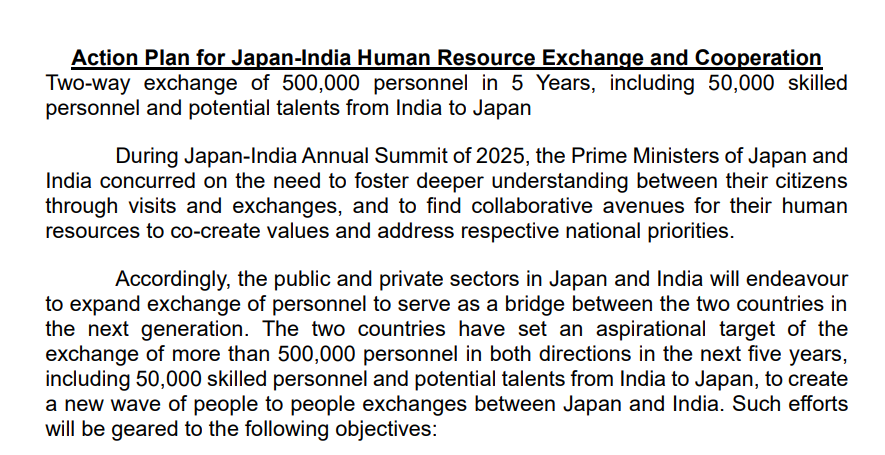 该人力资源行动计划指出,旨在在未来五年内实现50万名人员的双向交流,其中包括引进5万名印度技术人才和潜在人才到日本。