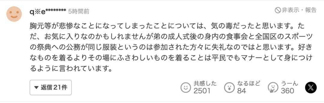 “因为穿衣不得体而引发尴尬,我觉得她蛮可怜的。但是或许她就是喜欢这样吧。她之前也在弟弟成人仪式后的私人聚会穿过,感觉蛮失礼的。相比穿自己喜欢的衣服,什么场合穿什么衣服,这对于平民而言,都是应该掌握的穿衣礼仪。”