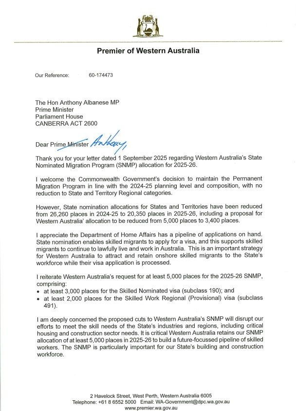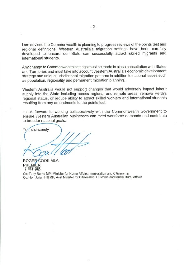 “西澳大利亚州不会支持任何可能对该州劳动力供应产生不利影响的改变,包括跨地区和偏远地区、取消珀斯的地区地位、或因积分测试的任何修改而降低吸引技术工人和国际学生的能力。”