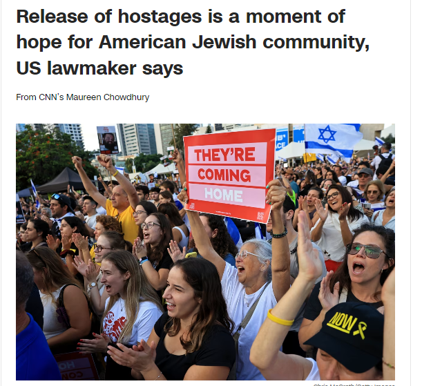 在特拉维夫,24岁的学生尤瓦尔说,他和朋友们从早晨八点起就在街头等候,“两年了,我们终于等到这一刻。”另一位学生盖伊补充说:“每个人都太激动了,我们要彼此陪伴,这一刻难以置信。”