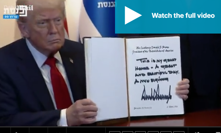 以色列总统赫尔佐格宣布,将授予川普以色列最高平民荣誉——总统勋章。川普在议会留言簿上写道:“今天是美好的一天,一个新的开始。”他在启程前还对记者说:“这场战争结束了。”