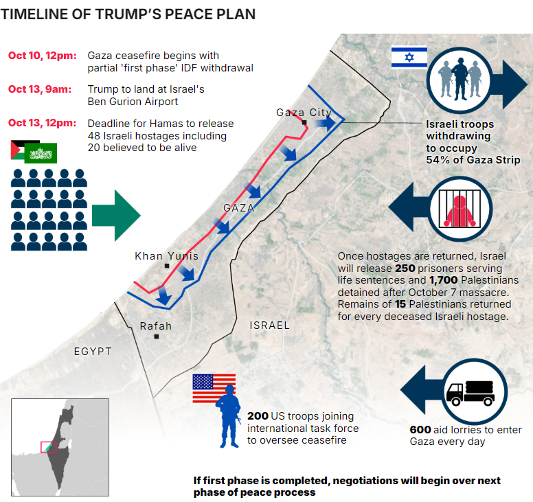 在签署仪式前数小时,哈马斯按协议释放了最后20名以色列人质;作为交换,以色列释放了约2000名巴勒斯坦囚犯,其中包括250名哈马斯成员,并启动了以军分阶段撤离计划。