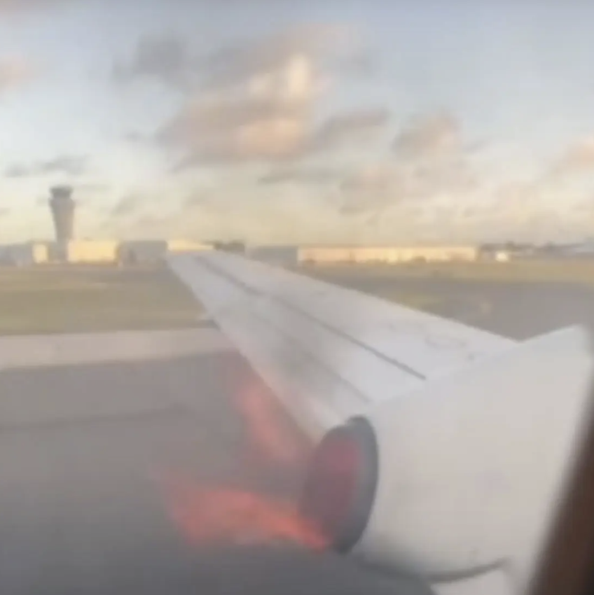 可以看见,这架飞机停在跑道上,左侧引擎喷出阵阵橙色火焰和黑烟,机舱内一片惊呼声。