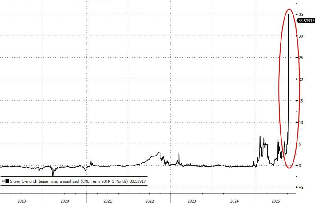 数据显示,伦敦白银的一个月租赁利率(即借入白银的成本)已飙升至30%以上,而隔夜借贷成本的年化利率甚至一度超过100%。