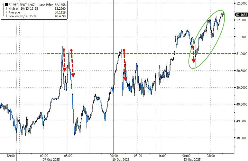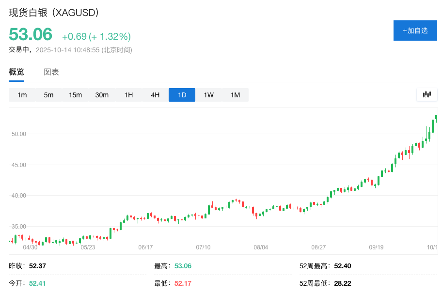 上午10时48分,现货白银突破53美元/盎司,再创历史新高。