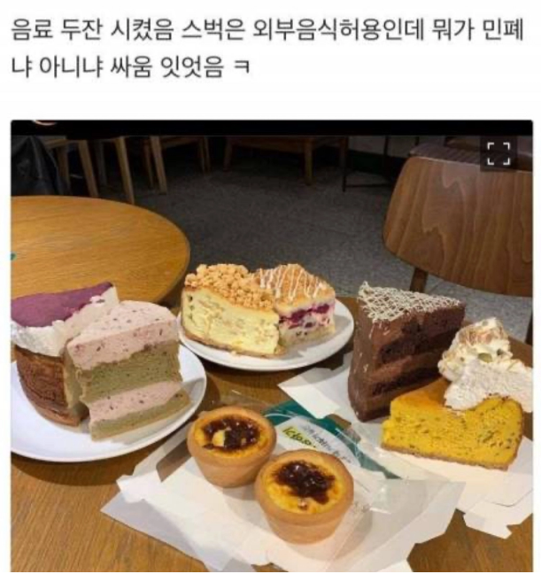 韩国网友吐槽道:“我以前遇到过打包紫菜包饭来星巴克吃的人,味道真是太大了,我和朋友坐一会儿就离开了”、“我在星巴克工作了十几年,至今为止见到过的外带食品有酒(啤酒、葡萄酒、威士忌)、炸鸡、杂烩面、炒年糕、寿司烤五花肉等”、“想起在星巴克用扬声器看动漫还吃外带食品的人,ptsd要发作了”、“可食用的外带食品就是简单的面包、饼干、巧克力这种,这难道不是常识吗”、“我在星巴克工作时有人外带了超大的蛋糕,然后要求我们按照人数提供盘子和叉子,最后吃得一团糟离去,餐具都是我们员工清洗”、“有时候就觉得他们像鬼附身一样,怎么到哪都要吃吃吃!就连参观博物馆都能掏出个野餐垫开始吃自带便当”、“听我在星巴克工作的朋友说,有在店里点炸酱面吃的”……