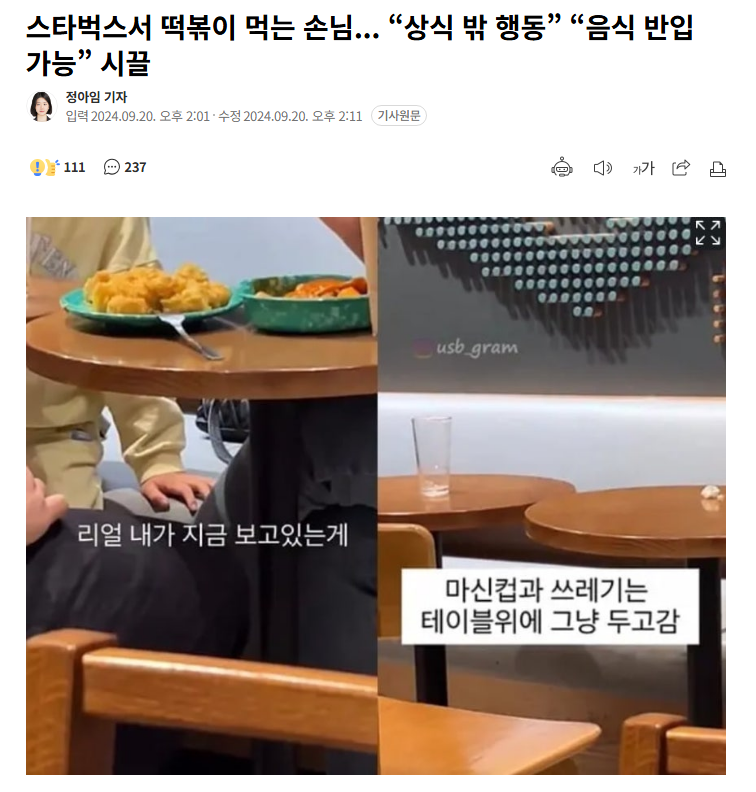 去年,某星巴克门店内有顾客端着盘装炒年糕和炸物进入店内与咖啡一同食用的画面被发布到社交媒体上,引发了关于此举是否属于“公害行为”的争论。