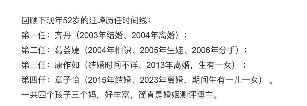 有网友梳理了汪峰的历任时间线,并调侃道:“一共四个孩子三个妈,好丰富,简直是婚姻测评博主”。