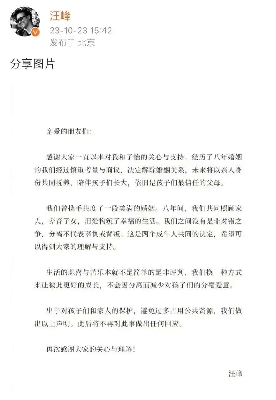 2023年10月23日,汪峰和章子怡公开发声宣布离婚。