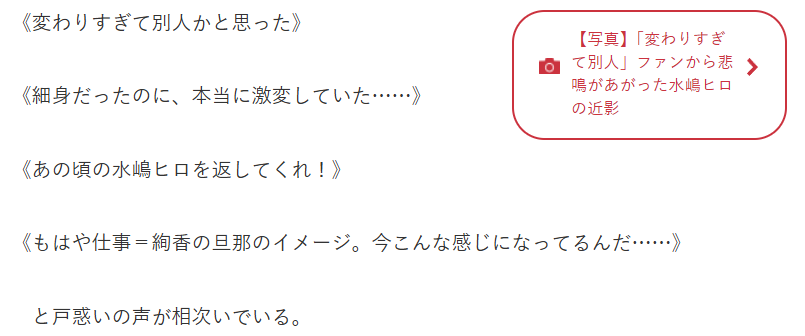 虽然外界的声音不断,尤其是对于水岛的颜粉来说,这次的冲击真是巨大。但其实,时间的流逝对人外貌的改变是理所当然的,“演员水岛宏”已经是过去式了,不同的年龄段有着不同的魅力,我们都要学会悦纳偶像,悦纳自己。