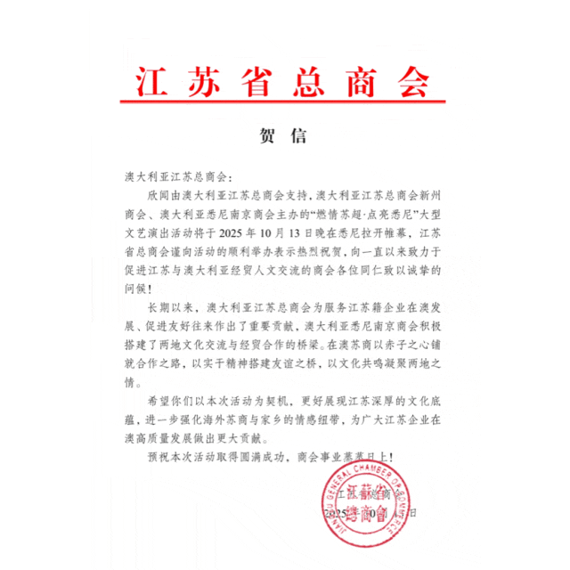 来自各方的祝福,是对在澳江苏人辛勤付出的肯定,也是对“苏超精神”的最好注解—跨越山海、共赴未来。