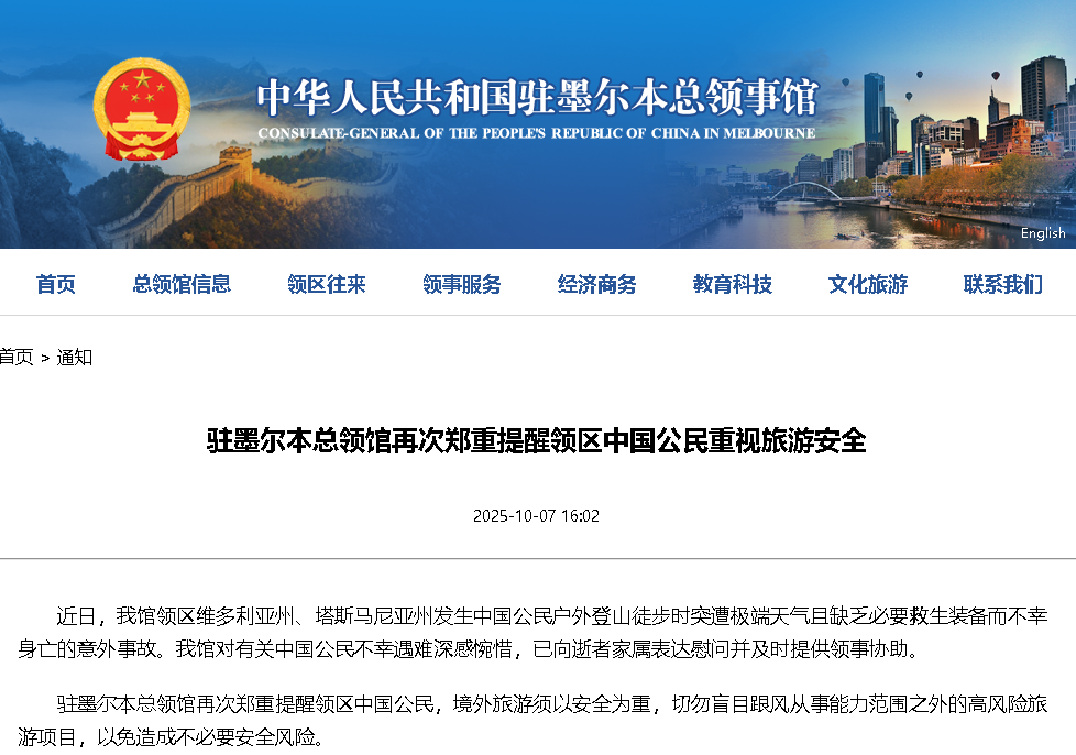 “近日,维多利亚州和塔斯马尼亚州相继发生中国公民在户外登山徒步时遭遇极端天气、缺乏救生装备而不幸身亡的事故。