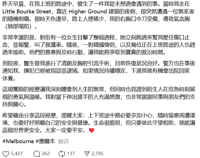 一名华人女生在清晨通勤途中,于Higher Ground建筑后侧遭遇无家者随机刺伤,右胸口中刀导致气血胸(肺部塌陷),引发华人社区广泛关注!