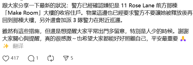 对此,物业管理部门已采取相应措施,要求警方确保嫌疑人在释放后不会再次回到该大楼,同时还将在附近加派三队警力巡逻。