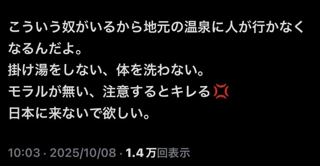当日就有日本游客将公告拍照上传至社交媒体,评论区迅速被愤怒与鄙夷的言论淹没:“正因为有这种人,温泉客人才越来越少。不冲澡、不讲礼貌、还会生气……真希望他们不要来日本。”