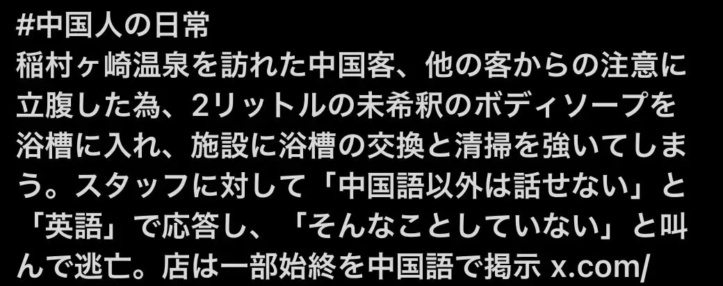 最近,日本社交媒体上掀起了一波“讨伐中国人泡温泉”的舆论热潮。在X(原Twitter)上,“中国人温泉”“稻村崎温泉”一度冲上热搜。
