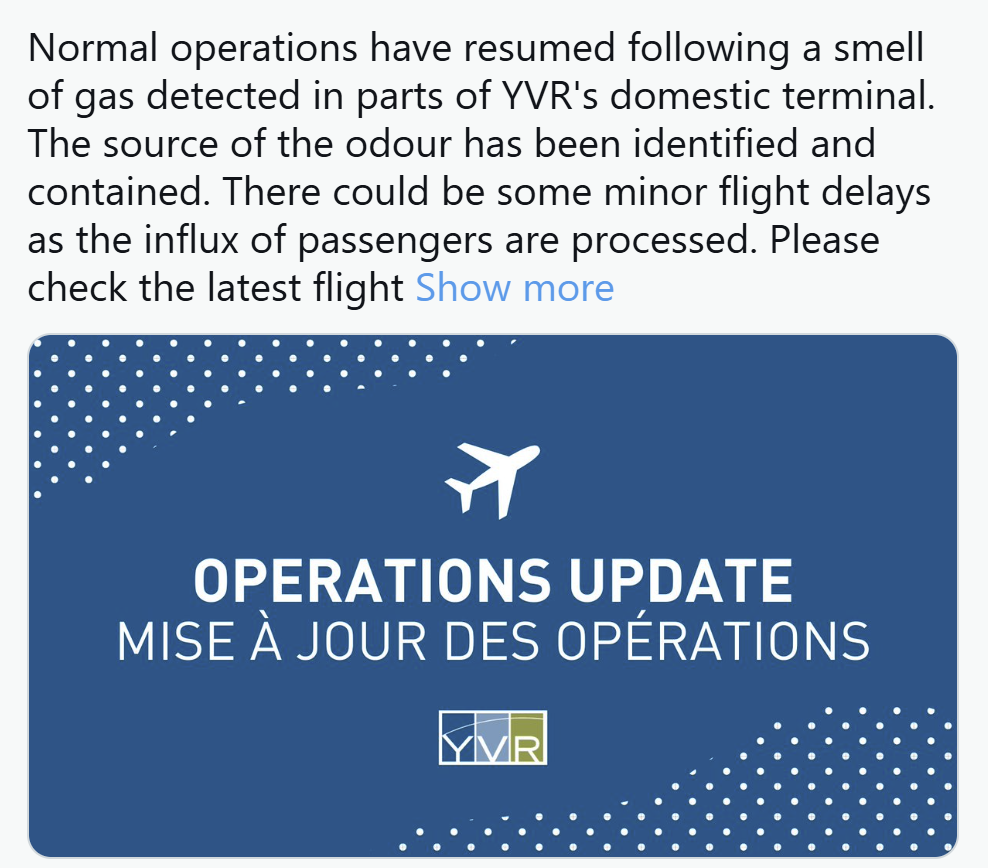 据最新消息,下午2点左右,温哥华机场的工作人员接连接到多起报告,说是国内航站楼内弥漫着“不明气味”,疑似天然气或化学气体泄漏。