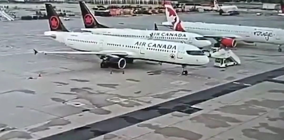 根据曝光的视频显示,在多伦多皮尔逊国际机场,这架印有加拿大航空标志的客机在地勤人员指挥下,试图在两架停靠中的飞机之间“入位”。