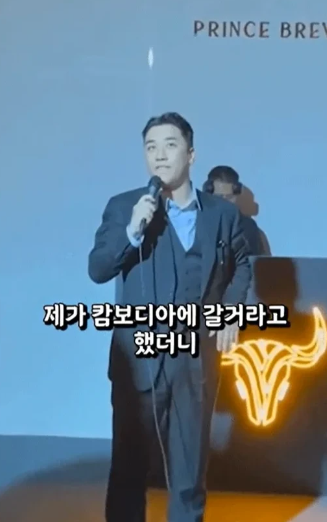 巧的是,在韩媒去年曝光的一段视频中,韩国前男星李胜利在柬埔寨举行的某次商业活动上登台发言称:“我和朋友们说,来柬埔寨看看吧,这里没有危险。 柬埔寨是亚洲最好的国家。”