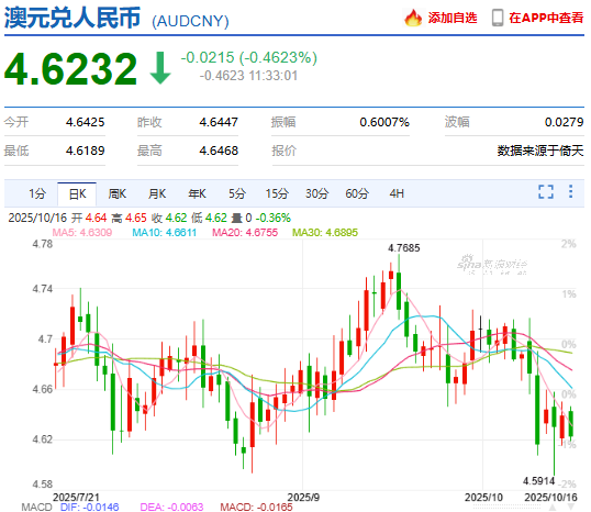 澳元兑人民币汇率也同样下跌,至4.6263。