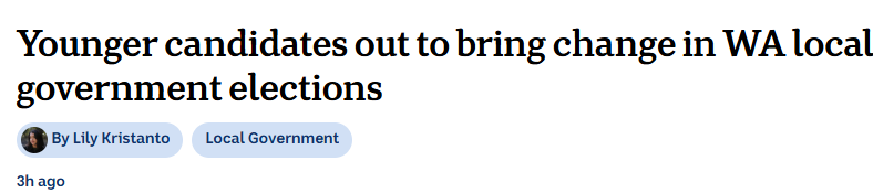 据《澳洲广播公司》10月17日报道,年轻候选人希望通过参与西澳地方政府选举,为地方政治注入新的视角和活力。