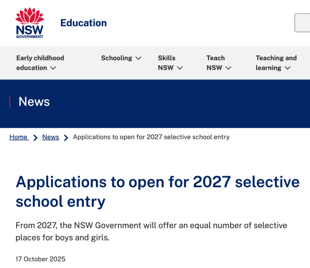 2027学年精英中学(Selective Schools)和“OC班”(Opportunity Classes)的入学申请将于2025年11月6日开放。