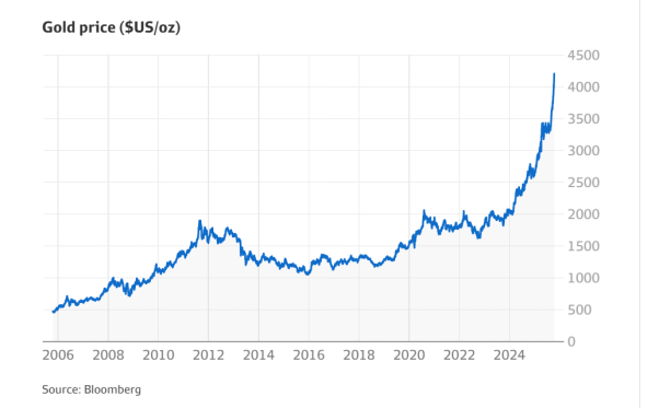黄金价格本周三首次突破每盎司 4100 美元(约合 6300 澳元),使今年的惊人涨势超过 50%。自2024年初金价开始上涨以来,总涨幅已接近 100%。