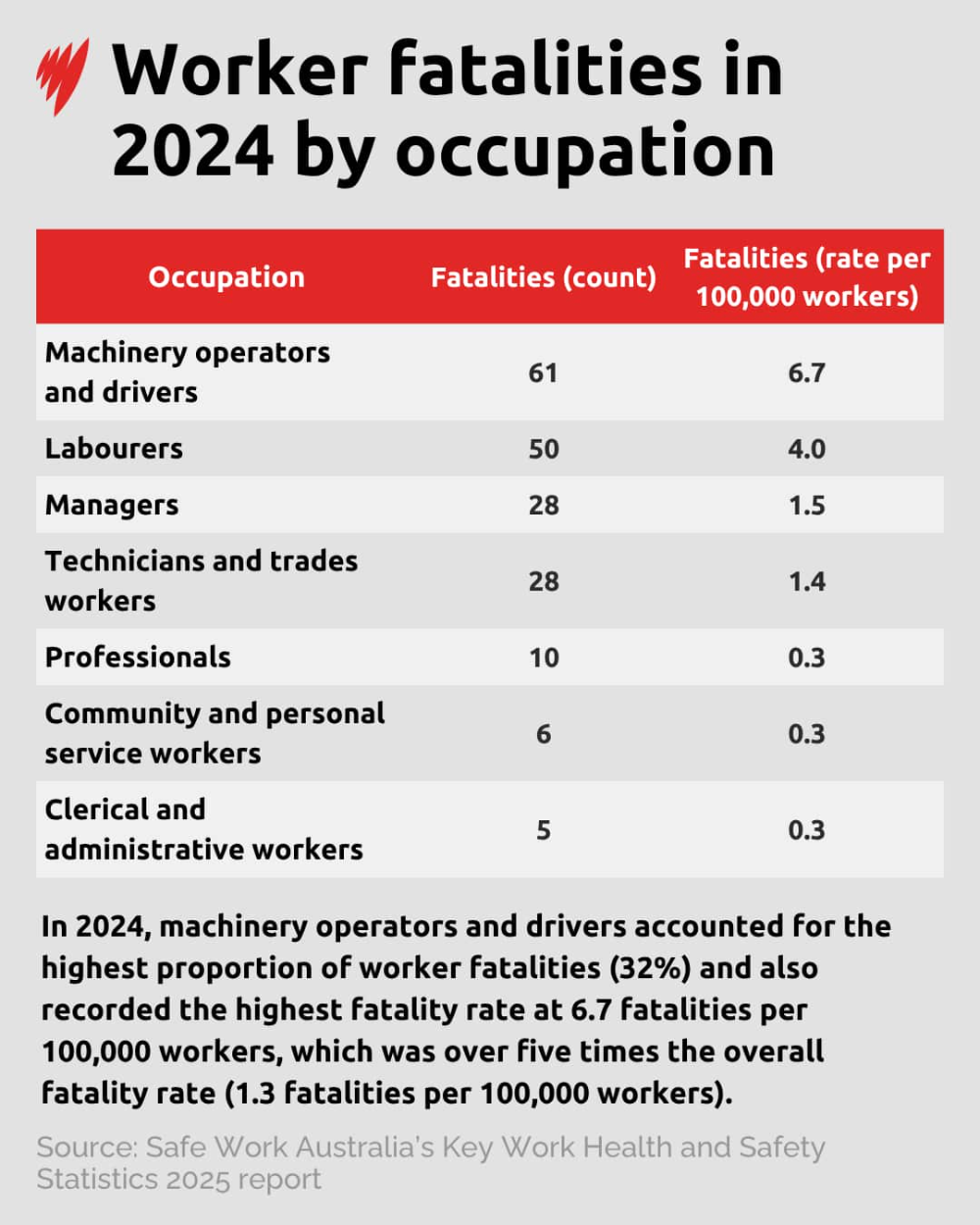 虽然过去十年澳洲工亡率下降了近四分之一,但报告提醒:2024年仍有188人没能回到家人身边。