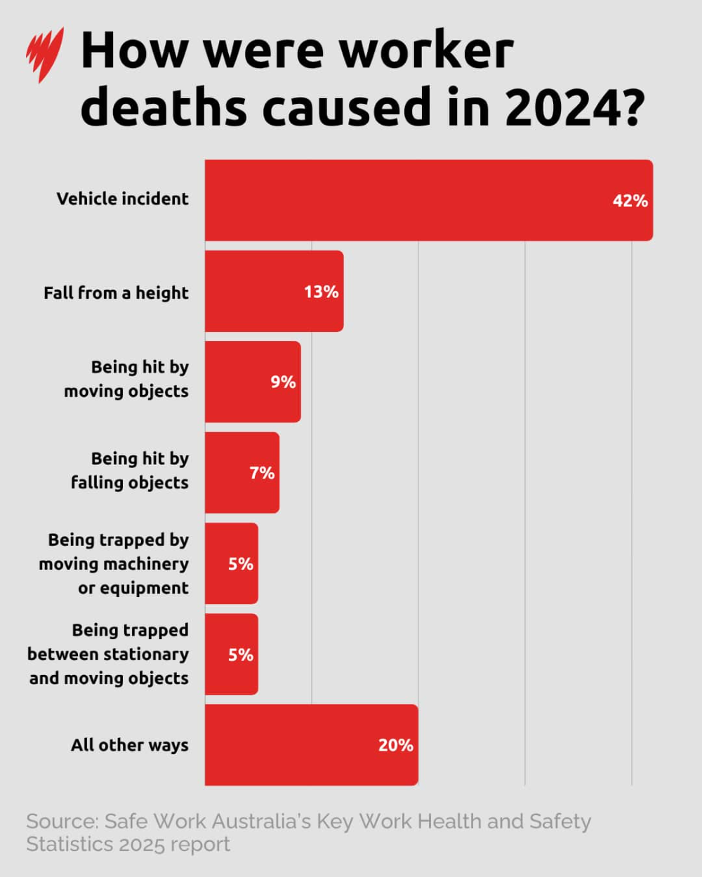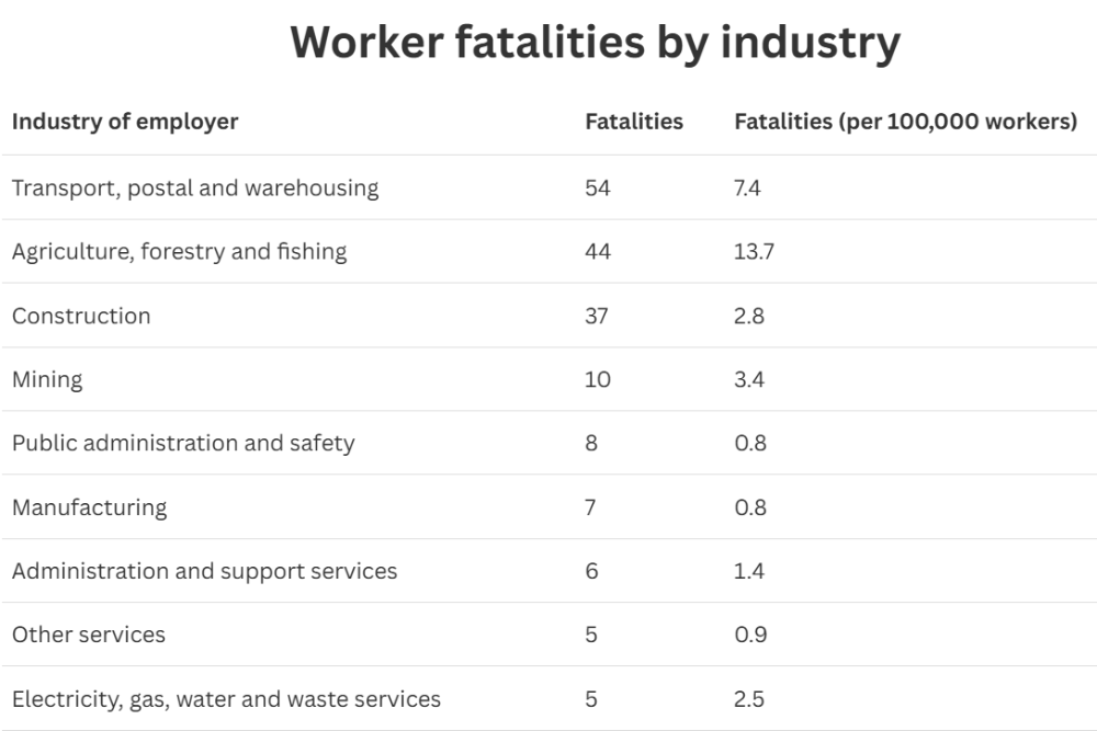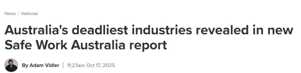 报告显示,2024年澳洲发生的因工死亡事故中,有80%集中在六个高危行业: