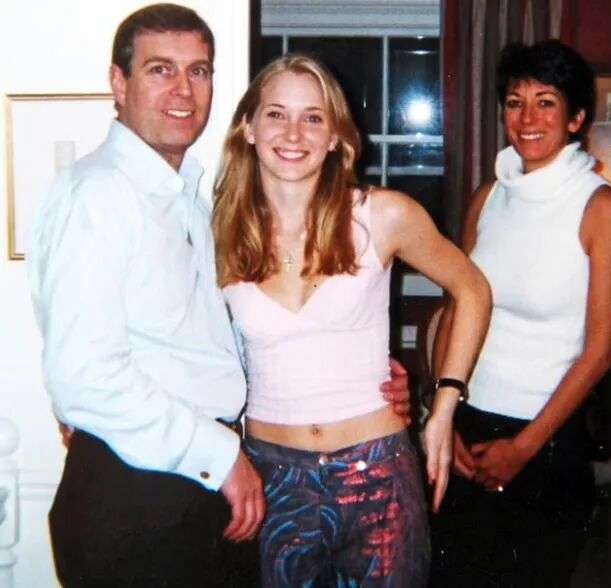 朱弗雷公布的据称是2001年在爱泼斯坦同伙马克斯韦尔(右)伦敦寓所拍摄的照片,照片中安德鲁王子(左)搂着朱弗雷(中)的腰。 社交媒体