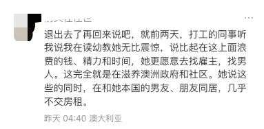 有网友说,打工同事听说她在读幼教,当场震惊:“比起浪费钱、精力、时间去读书,我宁愿找雇主、找男人。”