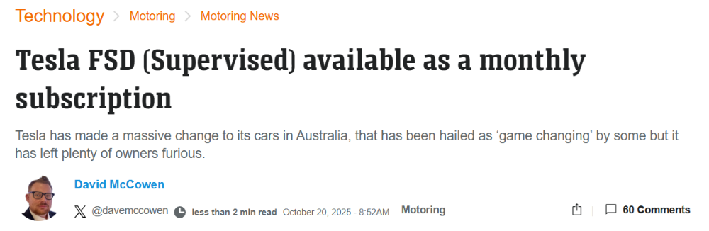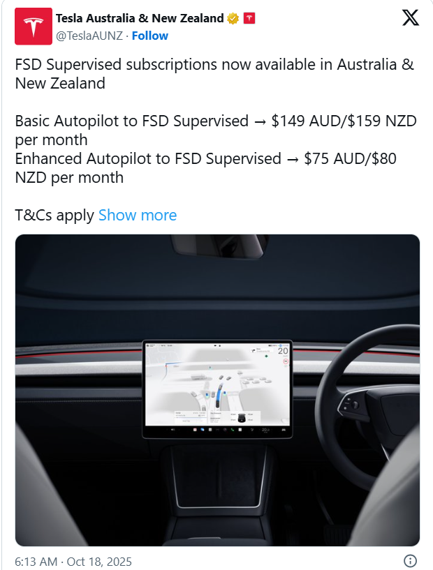 最近,特斯拉在澳洲推出了其备受瞩目的“全自动驾驶(监管版)”功能,也就是Full Self‑Driving(Supervised),简称 FSD Supervised。