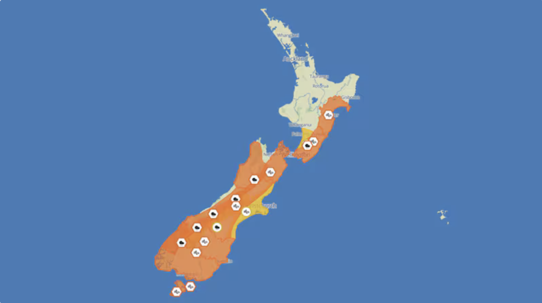MetService已对南岛东部和北岛下部多个地区发布橙色强风和暴雨警报。