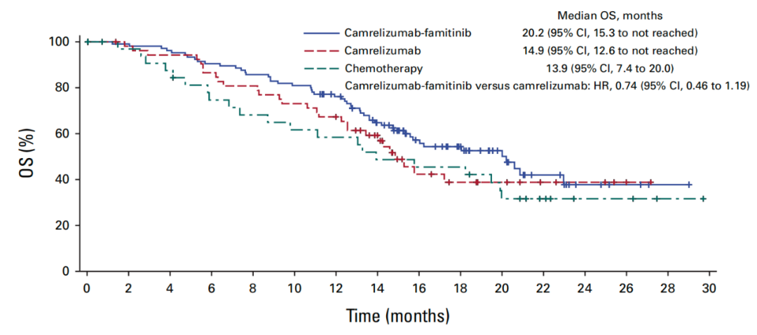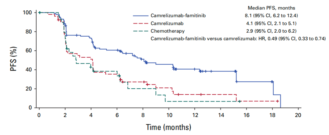 最新研究(SHR-1210-III-329)探索了一种新的治疗组合:卡瑞利珠单抗 + 法米替尼,对比了这种治疗组合与铂类化疗药物作为一线治疗手段的疗效和安全性。