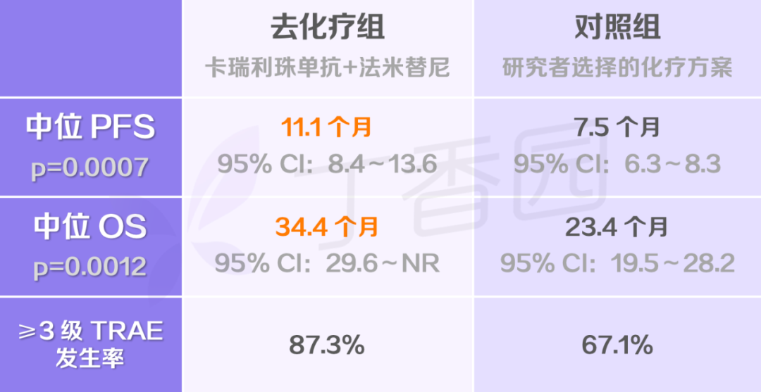 在安全性方面,去化疗组 ≥3 级的治疗相关不良事件(TRAE)发生率为 87.3%,对照组为 67.1%;因 TRAE 导致停止任何治疗的发生率,去化疗组为 13.6%,对照组为 6.6%,这些结果与此前的 II 期研究结果一致,并未发现新的不良事件。[3,4]