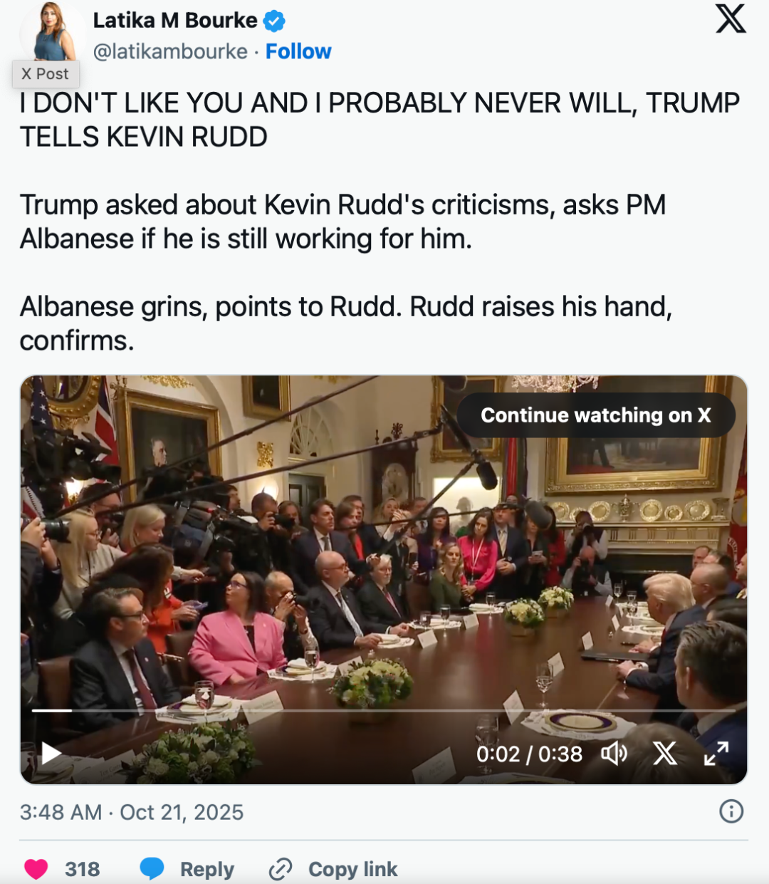 据了解,陆克文曾称特朗普是“美国历史上最具破坏性的总统”,这场当面对峙成为此次会晤中唯一的尴尬时刻。