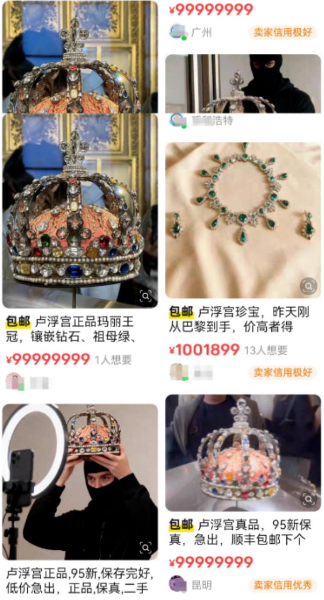 案发后,有记者在国内某二手交易平台上发现,有卖家发布“卢浮宫被盗珠宝”出售链接,标价从人民币 99 万元 到 9999 万元 不等。