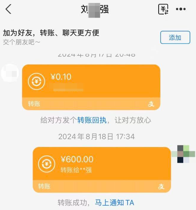 为了让他不再纠缠,2024年8月,我通过手机支付宝账号,退还了他600元,包含第一次他请吃饭的钱。当时他请的是一个128元套餐。2024年到2025年,我无法忍受他的骚扰,想办法远离他。