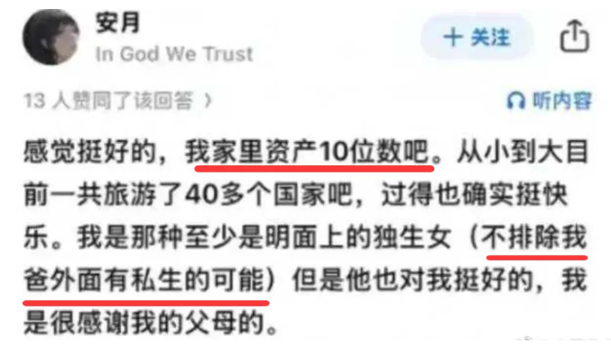 至于她的家底,她表示自家资产应该是10位数,从小就开始全球旅行。明面上自己是独生女,其他的不确定。