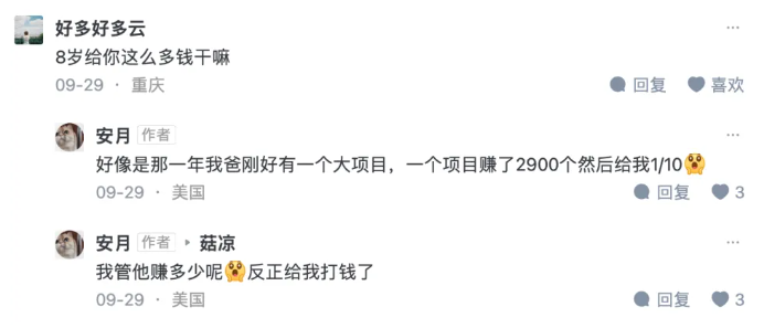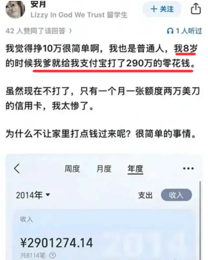 之后就是她的炫富内容了,首先是她还在8岁的时候,就已经收了290万人民币的零花钱。