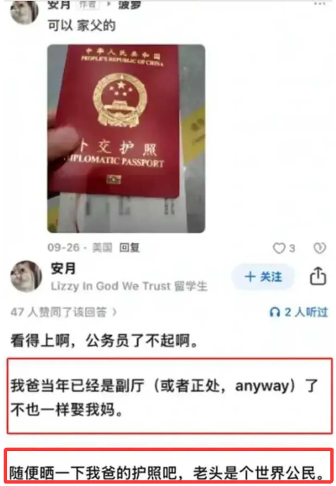 除了炫耀家庭的巨额收入之外,她还在帖子里面晒了一下外交护照。外交护照是什么定义,大家去网上搜索一下就能知晓,能够办理这个护照的人级别很高。