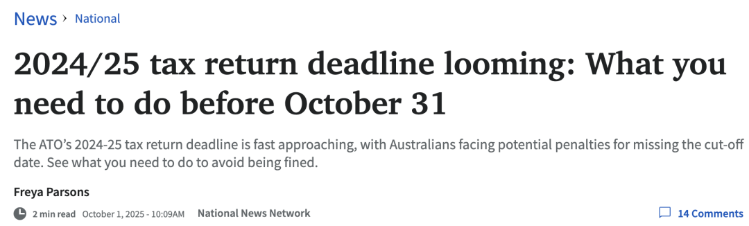如果大家是自行报税,即通过myGov或ATO在线服务报税,请务必在此日期前提交税表,以避免不必要的罚款和延误。